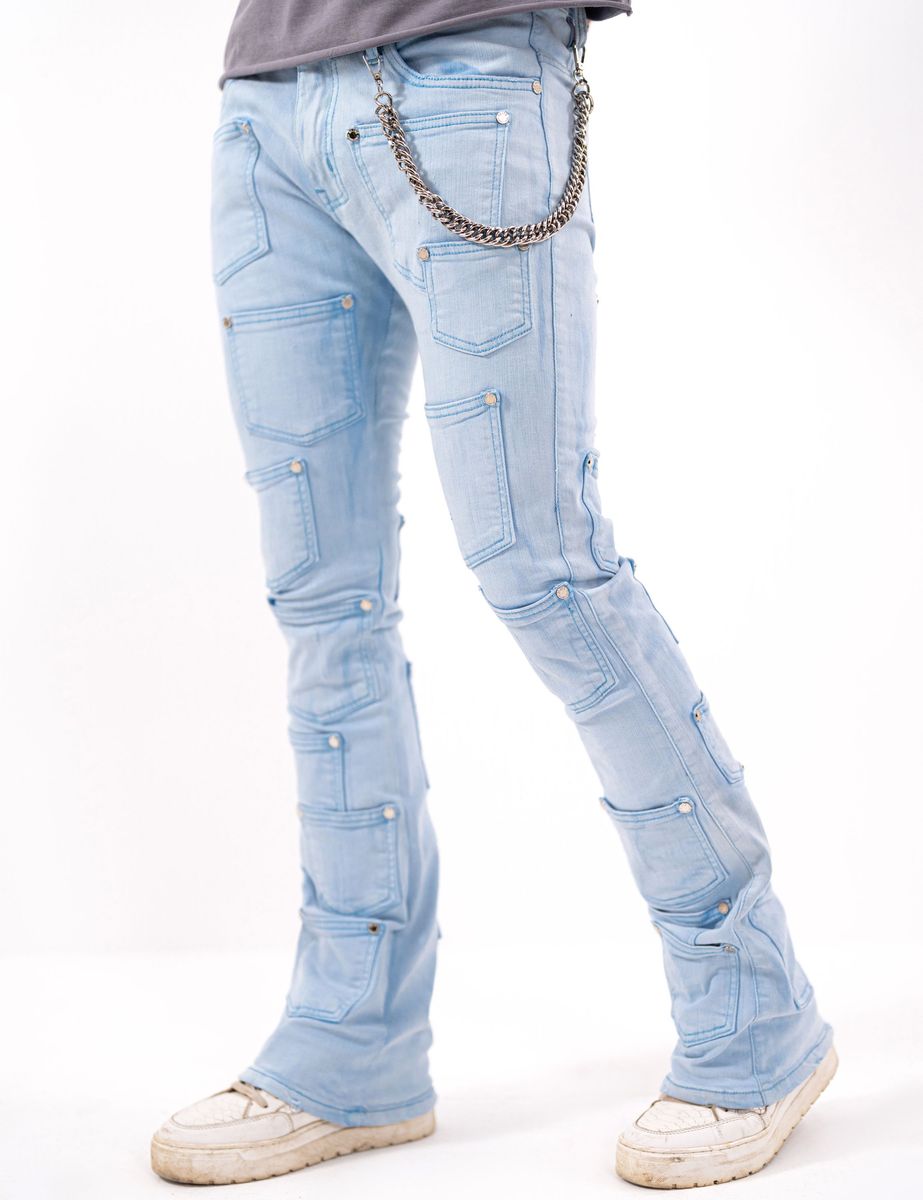 Cuban Link Mens Stacked RIVETS Jeans Blue Washed