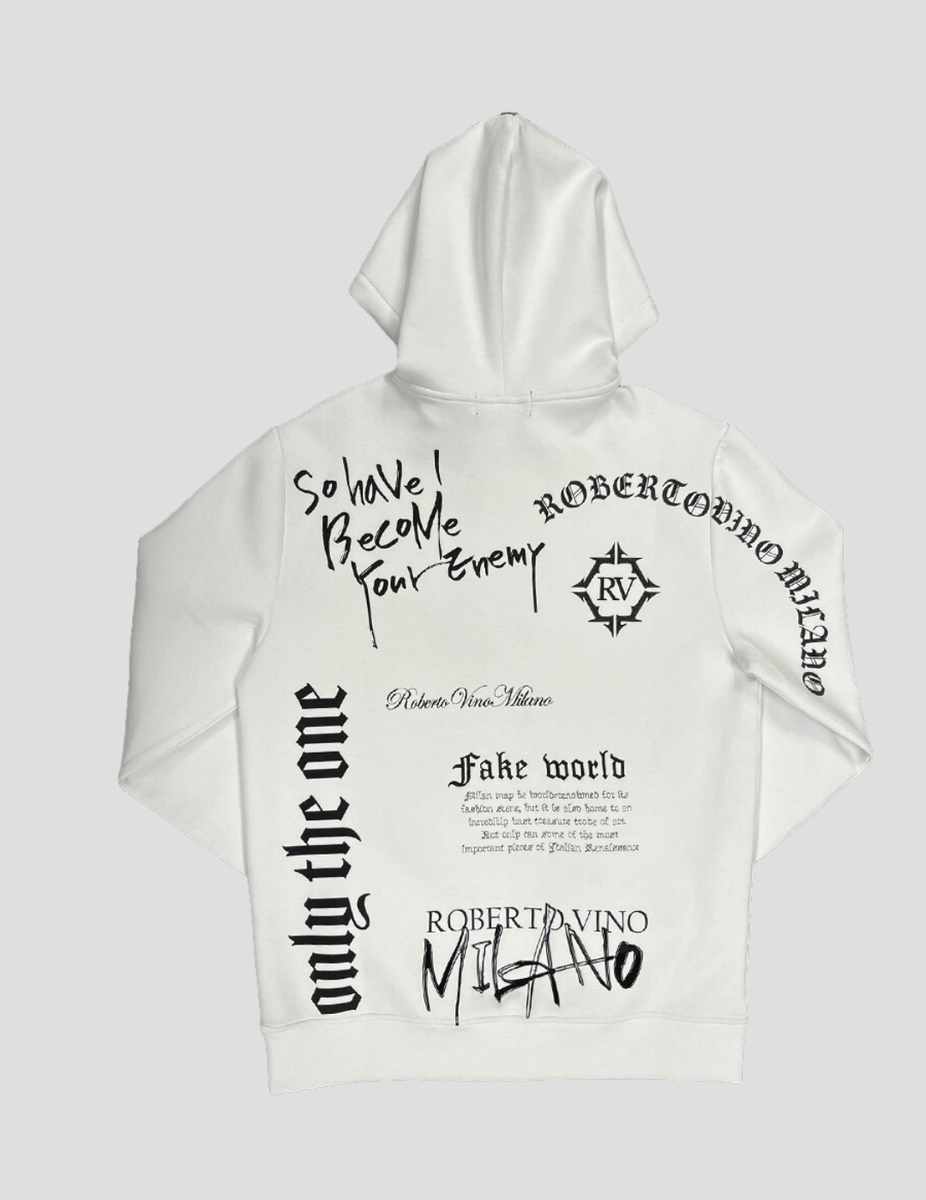 This hoodie features minimalist branding on the front with an embroidered black patch, while the back delivers an expressive message with bold phrases such as 'Fake World,' 'Only the One,' and 'So have I become your enemy.' The combination of gothic and graffiti-style fonts makes this hoodie a standout, giving it an edge for streetwear enthusiasts.